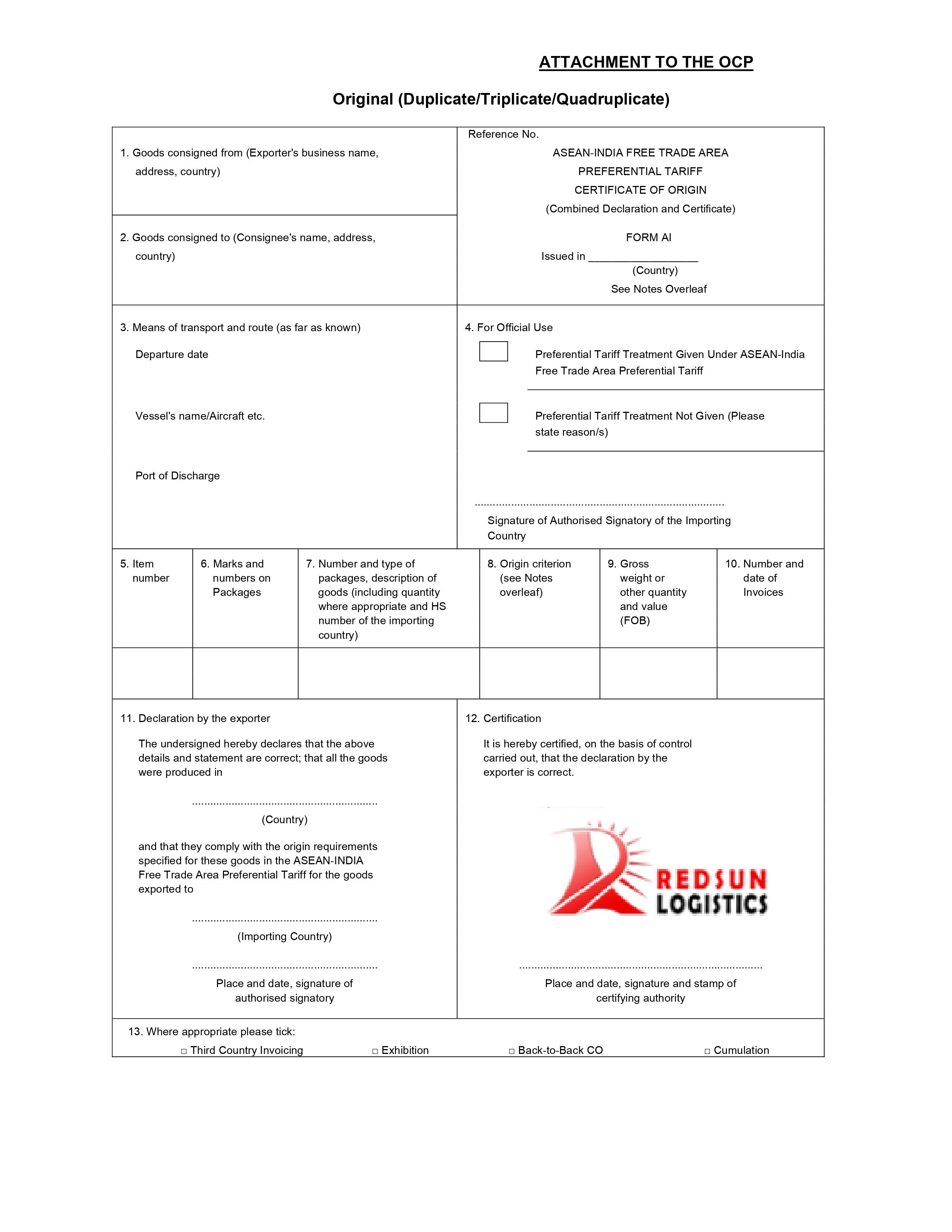 Hàng hóa xuất phát từ Ấn Độ đi đến các nước thành viên Đông Nam Á và ngược lại sẽ được hưởng các ưu đãi theo khung thương mại của Hiệp định về hợp tác kinh tế toàn diện giữa ASEAN và Chính phủ Ấn Độ nếu có Chứng nhận xuất xứ mẫu AI.
