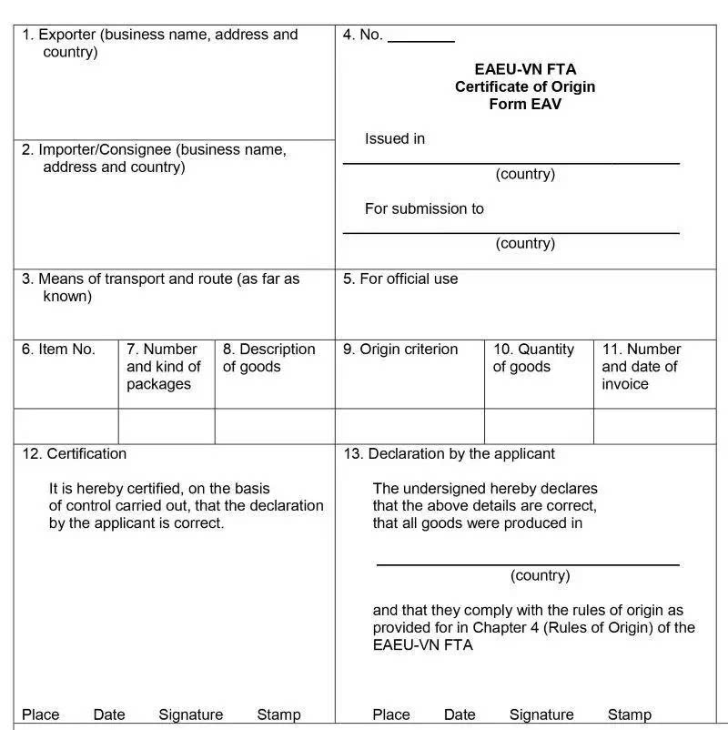 Hàng hóa xuất nhập theo Hiệp định VN - EAEU FTA sẽ sử dụng Mẫu chứng nhận xuất xứ Form EAV